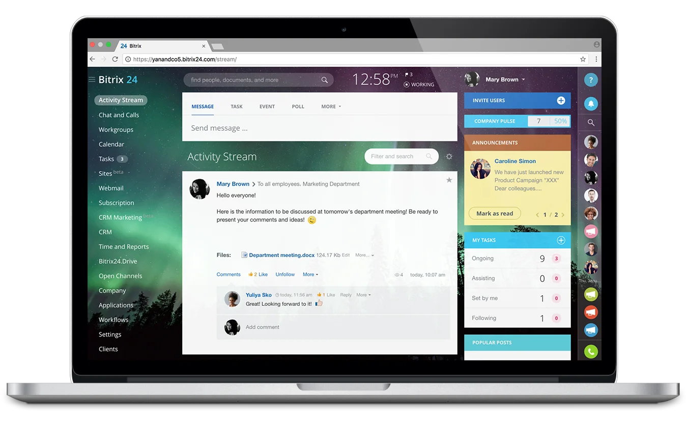 Şirket kültürü inşa ve teşvik etmek İK departmanları için zor bir görevdir. Bitrix24 ofis yönetimi yazılımı şirketiniz için sosyal ağ ve katılım araçları sunar.