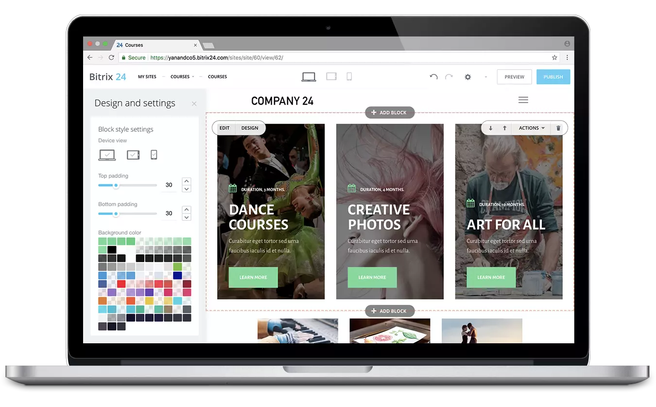 Hiçbir iki şirket tamamen aynı değildir, öyleyse neden iki web sitesi aynı olsun? Şirketinizin kişiliğine ve kültürüne uyan özelleştirilmiş bir tasarım oluşturmak için Bitrix24 web sitesi oluşturucuyu kullanın. Temiz ve profesyonel tasarımlara erişin ve ardından bunları ihtiyaçlarınıza göre özelleştirin. Şirket sitenizin tamamen size ait olması için pek çok eğlenceli tasarım öğesi ve düzen seçeneği mevcuttur.