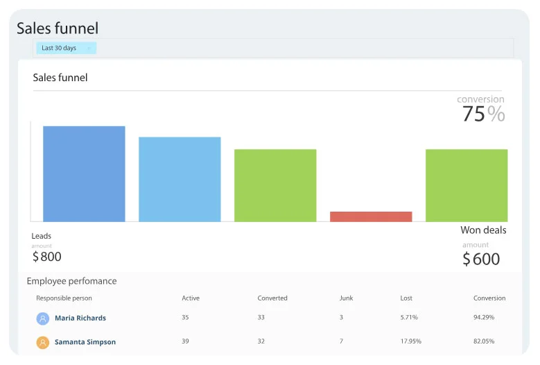 Sonuçlarınızın tam bir dökümünü almak için satış hunimizi kullanın. Satış kotalarına ulaşıp ulaşmadıklarını görmek için ekibinizin KPI'larını takip edin.