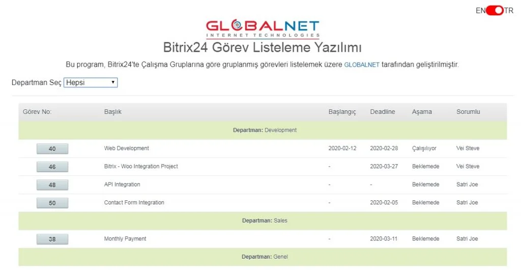 GLOBALNET Bitrix24 Görev Listeleyici (Task Lister) Uygulamamızın özellikleri;