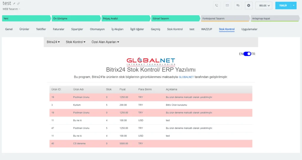 GLOBALNET Bitrix24 Stok Kontrol Uygulamamızın özellikleri;