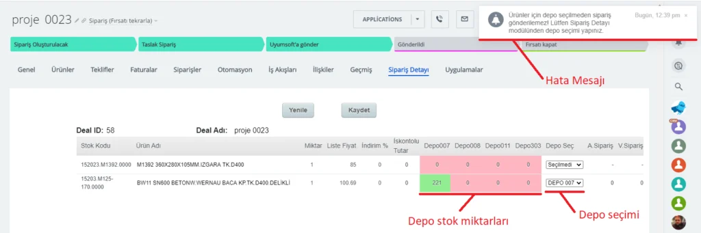 Bitrix24’te oluşturulan sipariş kartlarına eklenen ürünlerin stok ve depo bilgilerinin UYUMSOFT’tan alınması,
