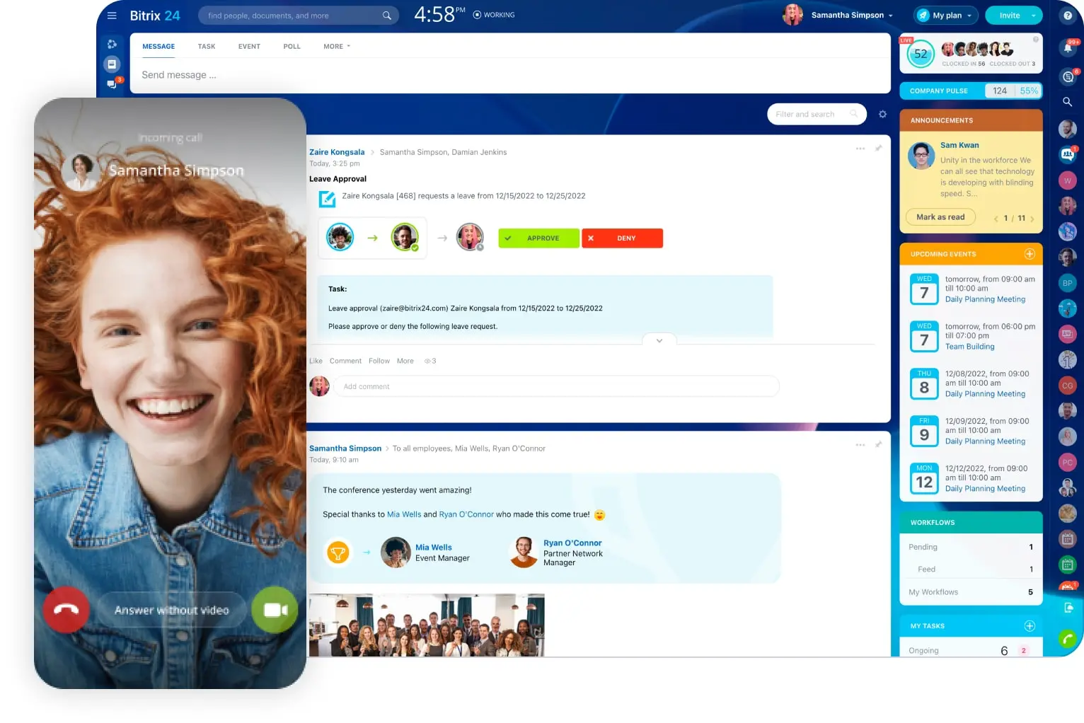 Ekibiniz, Bitrix24'te yerleşik bir çevrimiçi zaman saati kullanarak çalışma gününü başlatabilir/duraklatabilir/bitirebilir.